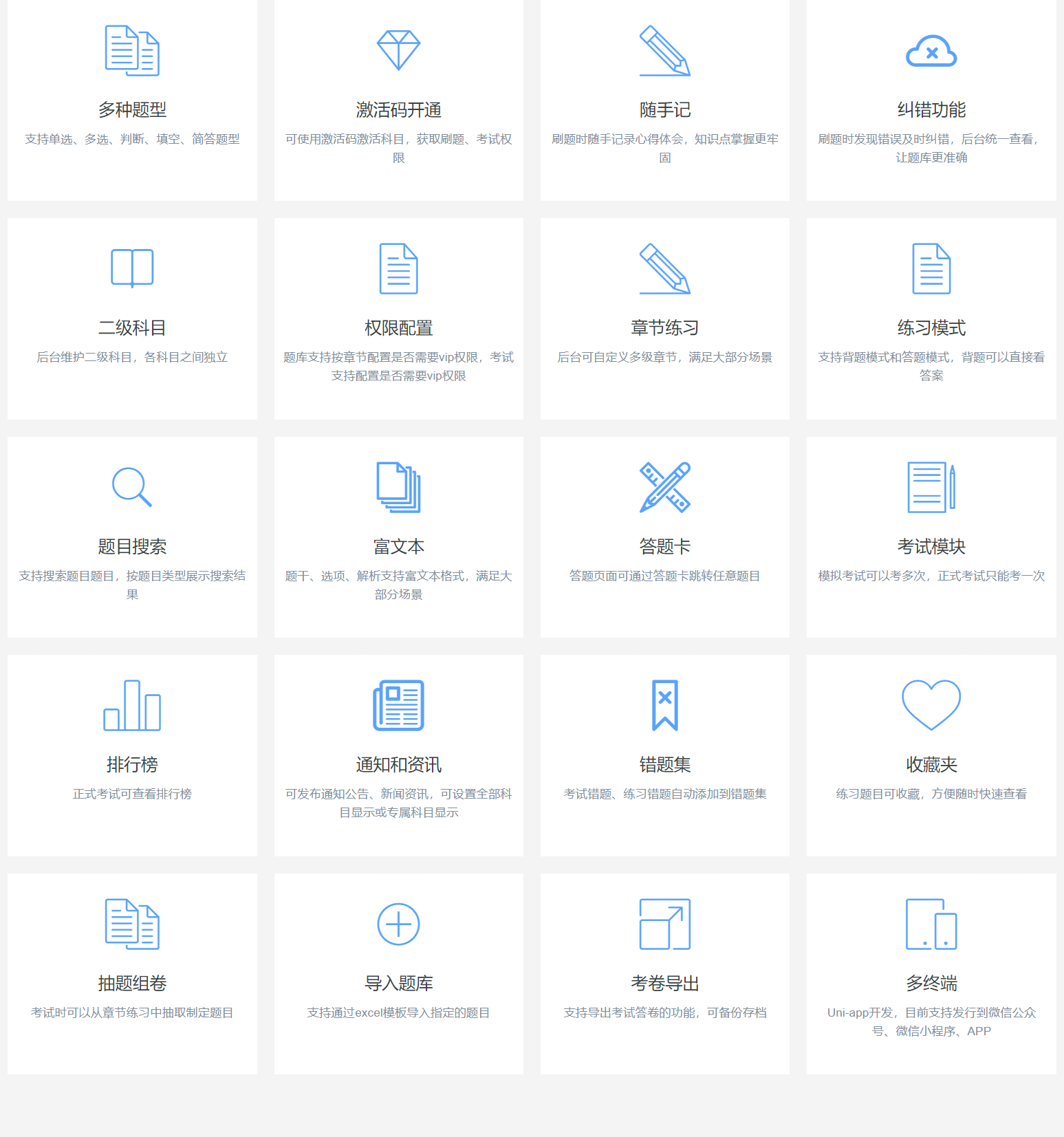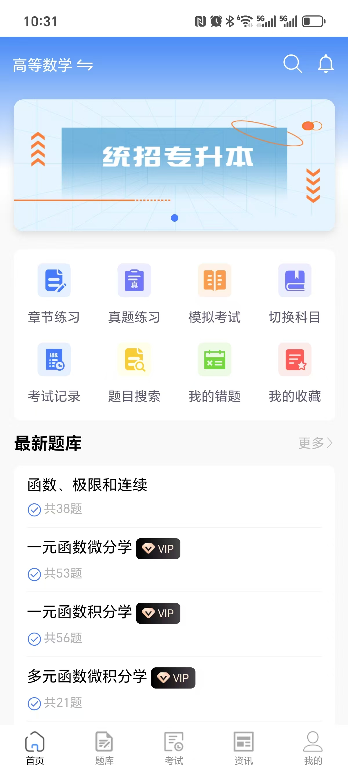 包含章节练习、历年真题、错题记录、模拟考试和正式考试等模块